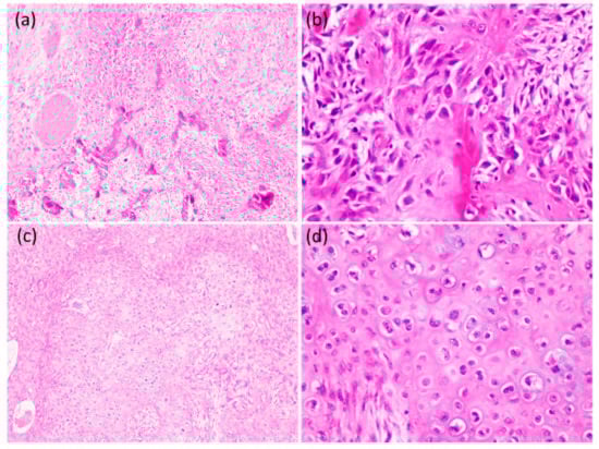 Histological findings of the tumor. (a) There were foci of osteoid and irregular trabeculae formation (100×). (b) It showed a proliferation of short-spindle and polygonal-shaped atypical cells with hyperchromatic nuclei (400×). (c) The foci of lobules of cartilage formation were found (100×). (d) Increased cellularity and atypical round-to-oval cells in lacunae were noted (400×).