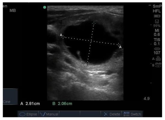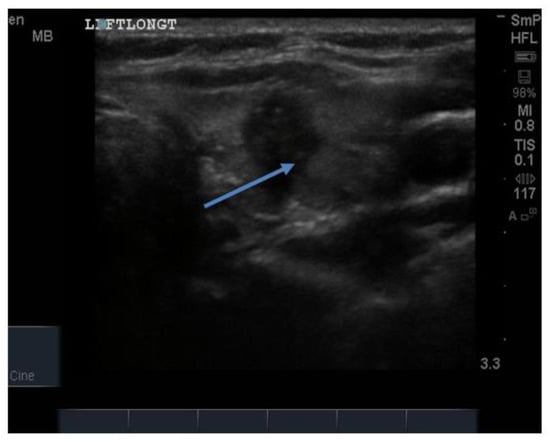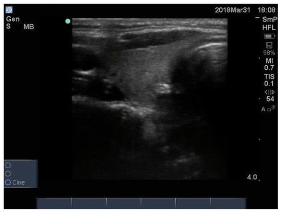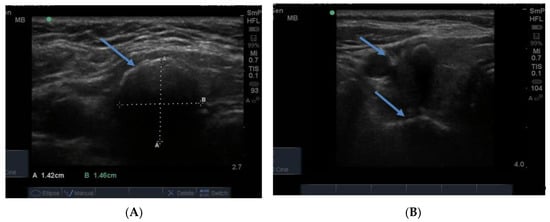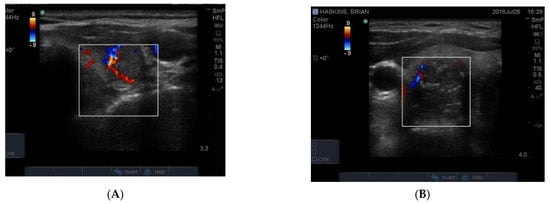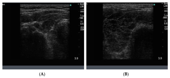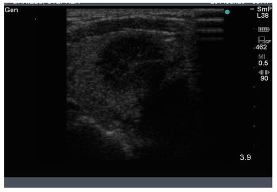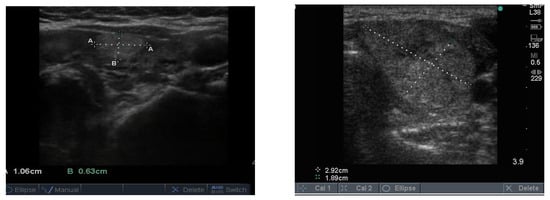 Follicular nodules are much less common than colloid nodules with a different appearance on ultrasound; they are more cellular, giving a solid appearance, with a whitish colour, i.e., less hypoechoic. They too have a sharp edge and halo and grow slowly over time []. The problem with these lesions is that FNAB is unable to differentiate between a benign follicular adenoma and follicular cancer, and if the latter is suspected, thyroid surgery is the final arbitrator. About 10% of benign thyroid nodules are follicular, and most of them end up being removed. Two examples of follicular nodules that were finally proven to be benign are shown in Figure 4. On follow-up ultrasound (US), 6–12 months later, repeat biopsy might be indicated if a nodule has grown by 20% or more in two or more dimensions; benign nodules also grow, but less quickly.