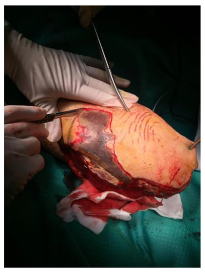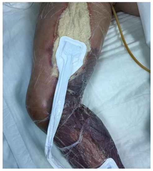 On 04 August, clinical evaluation documented that the patient was in comatose status and an infection sustained by Klebsiella species was detected (Table 3). On 06 August, the fasciotomy of the right limb revealed the presence of a black fluid where microbiology testing detected the presence of Aeromonas veronii biovar sobria (resistant to ampicillin, MIC > 32, but sensitive to ceftazidime MIC < 0.12, cefuroxime MIC < 1, ceftriaxone MIC < 0.25, and ciprofloxacin MIC < 0.06). On physical examination, her lower limb was warm in the presence of erythema. After 12 h, the swelling of her leg and the progression of skin lesions (circumferential erythema developed in bullae formations) increased until the development of a compartment syndrome, which rapidly required a surgical treatment with fasciotomy and negative pressure wound therapy (Figure 1).