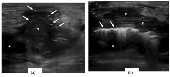 Point-of-care ultrasound revealed (a) A hypoechoic mass (arrowhead) surrounding with a dirty shadow (arrows) around the femoral artery (asterisk). (b) A hypoechoic mass (arrowhead) and an echogenic rim with dirty posterior shadowing (arrows) along the femoral artery (asterisk).