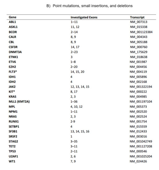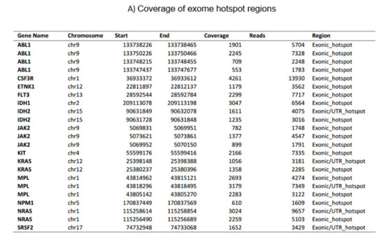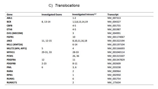 Figure 1. The current myeloid next-generation sequencing panel. (A) Coverage of exome hotspot regions. (B) Point mutations, small insertions, and deletions. (C) Translocations. - C.