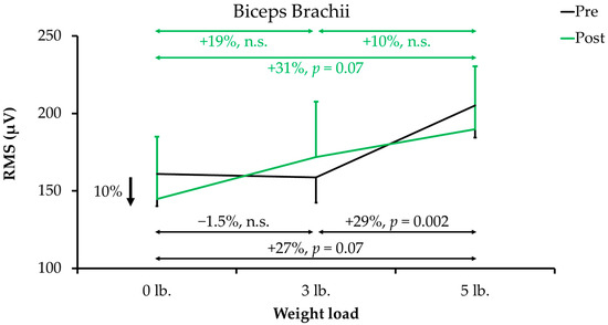Surface electromyography (sEMG) activity of the biceps brachii before and after the resistance training program. Data are reported as the mean ± SE. The black line represents sEMG activity before the resistance training program, and the green line represents sEMG activity after the resistance training program. Abbreviations: n.s., non-significant; RMS, root mean square.