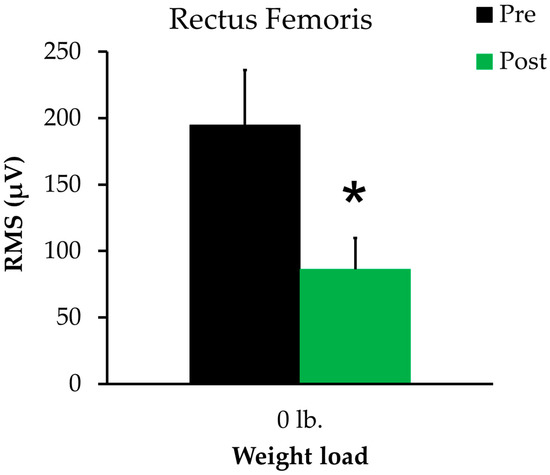 As shown in Figure 1, before training, the biceps brachii’s RMS (µV) did not change in response to a 3 lb. load (change of −1.5%); however, with a 5 lb. weight load, RMS increased by 27% compared to 0 lb. weight load (p = 0.07) and 29% compared to 3 lb. weight load (p = 0.002). After eight weeks of resistance training, the RMS value with 0 lb. was 10% lower than the pre-training value. With a 3 lb. weight load, RMS was increased by 19% compared to the 0 lb. weight load and continued to increase by 31% compared to the 0 lb. weight load (p = 0.07, increase compared to 3 lb. weight load was 10%). When a two-factor ANOVA was performed, a significant difference was observed within the group (p = 0.022), but not between groups (p = 0.625). Similarly, as shown in Figure 2, before training, upper trapezius’ RMS did not increase significantly with the 3 lb. weight load (increase of 6%). After completion of the training, the RMS value with 0 lb. weight load was not different (0%), whereas the 3 lb. weight load tended to increase RMS by 20% (p = 0.10). When a two-factor ANOVA was performed, a significant difference was observed within the group (p = 0.023), but not between groups (p = 0.492). Lastly, as shown in Figure 3, a significantly lower RMS value (decreased by 56%) was recorded for the rectus femoris after completion of the program (p = 0.04).