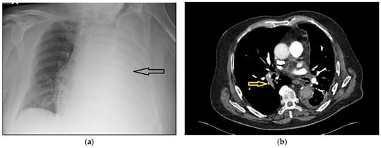 (a) Chest radiograph showing a large left-sided pleural effusion (marked with arrow); (b) slice of computed tomogram scan showing a right-sided pulmonary embolism (marked with arrow), small left-sided pleural effusion and pleural thickening consistent with a pleural malignancy.