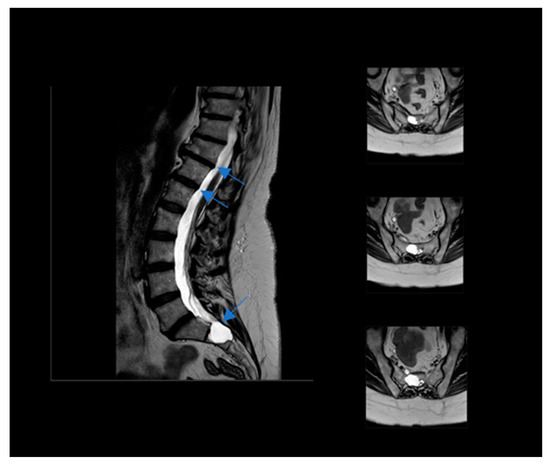 Nuclear Magnetic Resonance of the patient Tarlov’s Cyst indicated by blue arrow.