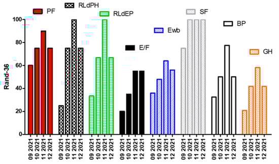 Rand-36 questionnair results: PF, Physical Functioning; RLdPH, Role Limitations due to Physical Health; RLdEP, Role Limitations due to Emotional problems; E/F, Energy/Fatigue; Ewb, Emotional well-being; SF, Social Functioning; BP, Body Pain; GH, General Health.