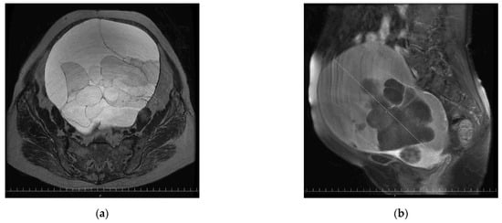 The pelvic magnetic resonance image (MRI) taken before staging a laparotomy. (a) T2-weighted pelvic MRI coronary showing giant ovarian polycystic tumor. (b) T2-weighted MRI sagittal showing a partially solid polycystic tumor 24 cm in diameter.