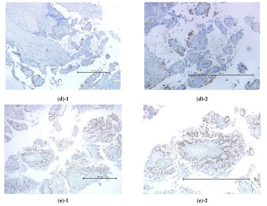 Histopathological examination of mucinous borderline ovarian tumor of the patient of this current case. (a) Histology of a case of mucinous borderline ovarian tumor showing the absence of stromal invasions (slides H and E). (b) Further sections of slides H and E, also indicating a lack of stromal invasions. (c) CK7: strongly positive. (d) CK20: weakly positive. (e) PAX-8: moderately positive. (a)-1, (b)-1, (c)-1, (d)-1, (e)-1, low-magnification; (a)-2, (b)-2, (c)-2, (d)-2, (e)-2, high magnification.