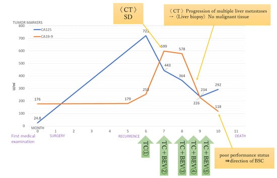 Owing to multiple liver metastases, secondary debulking surgery was not performed. The microsatellite instability test yielded negative results. The patient received five courses of paclitaxel and carboplatin therapy (TC) (concomitant with bevacizumab (BEV) after the first course). The serum CA-125 and CA19-9 levels were measured three times after the first chemotherapy (Figure 3). At the start of the first course of TC, both CA-125 and CA19-9 levels were elevated at 721.3 and 253 U/mL, respectively. At the end of the second course of TC + BEV, CT revealed that the disseminated intrapelvic lesions had partially shrunk. Although CA-125 levels decreased (443 U/mL), CA19-9 levels were still elevated at 599 U/mL. We concurred that the tumor showed stable disease at this point. Because the clinical course was nonspecific for BOT (FIGO stage I), it was necessary to check whether the recurrence had been a BOT or invasive carcinoma. After the fourth course of TC + BEV, a liver biopsy was performed to make a decision on recurrence. However, no malignant tissue was detected. Therefore, we concluded that the tumor recurrence had occurred, also taking the clinical course into account. Although the patient continued the therapy, she became unresponsive to it. Cancerous peritonitis and increasing ascites resulted in a poor performance status in this patient. Chemotherapy was withheld after the fifth course of TC + BEV. The patient died 5 months after the relapse, that is, 9 months after the primary surgery.