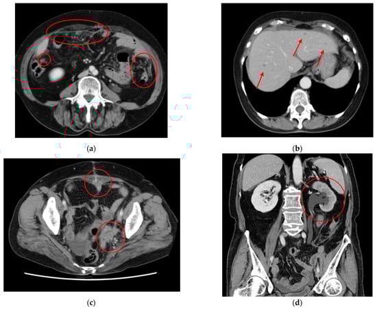 Abdominal and pelvic computed tomography scans after the recurrence was revealed. (a) The circled areas show peritoneal metastasis. (b) Arrows indicate multiple liver metastases. (c) The circles show peritoneal metastasis and left ureter infiltration. (d) The circles show left hydronephrosis.