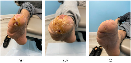 Figure 1. Progression of the diabetic foot ulcer throughout amniotic membrane allograft applications. (A) Date of exam: 1 February 2022; DFU measurements: 5.3 cm × 4.3 cm × 0.1 cm. (B) Date of exam: 22 February 2022; DFU measurements: 4.2 cm × 3.5 cm × 0.1 cm. (C) Date of exam: 15 March 2022; DFU measurements: DFU is now closed.