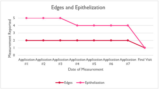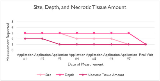 Individual elements of the wound were examined during all seven allograft applications. These elements included the measurement of the wound size, depth, edges, necrotic tissue amount, and epithelization. All five elements decreased from the initial allograft application to the final wound closure (Figure 2 and Figure 3). Upon initial examination in January, the wound measured 5.5 cm × 4.5 cm × 0.3 cm (Table 1), with full-thickness skin loss involving damage or necrosis of the subcutaneous tissue. The edges of the wound were distinct and attached with a clearly visible outline. Necrotic tissue covered less than 25% of the wound bed. At the final examination in March, the wound was noted as being superficial, measuring 0.0 cm × 0.0 cm × 0.0 cm (Table 1), with intact skin and non-blanchable erythema. No edges or necrotic tissue were present. While improvements were seen in all five categories, perhaps the most notable of these elements was epithelialization. The DFU was classified as a 5 upon initial examination in January, correlating to less than 25% of the wound being covered. Over the 49 days, the epithelization of the wound increased from less than 25% to 100% wound coverage by the final patient visit (Table 2). This large-scale epithelization of the DFU provides the protective barrier essential to eliminating pathogens during the healing process. The patient experienced complete wound epithelization within seven weeks of weekly allograft applications. This is compared to the 18 months before application when the patient did not have any epithelization advancements. Evidently, the application of dehydrated amniotic membrane allografts was essential in augmenting the healing process of the DFU.