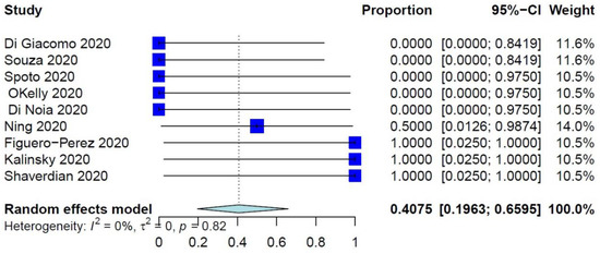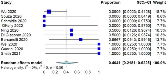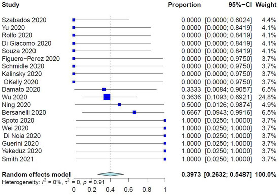 The PER of COVID-19–related mortality was 39.73% (95% CI: 26.32–54.87%) (Figure 1), while the PER of COVID-19–related ER visits, pulmonary complications, and need for ventilation were 40.75% (95% CI: 19.63–65.95%), 40.41% (95% CI: 21.81–62.25%), and 34.92% (95% CI: 17.34–57.86%), respectively (Figure 2 and Figure 3, Supplementary Figure S2). The PER of opportunistic infections was 34.92% (95% CI: 17.34–57.86%) (Supplementary Figure S3). Table 2 and Supplementary Figures S4–S8 show the PERs of the use of antivirals (62.12%), antibiotics (57.12%), steroids (51.36%), prophylactic anticoagulants (41.90%), and convalescent plasma (26.48%). As shown in Table 2, none of the patients in the included studies received antibodies, needed readmission, needed tracheostomy, or developed thrombo-embolic events due to COVID-19 infection. Nevertheless, 27% of patients had airway problems after COVID-19 infection in the nine included studies that assessed this outcome.