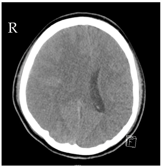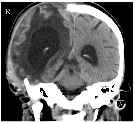 Source control was also conducted: the initial LD was removed, and a new EVD was inserted due to ongoing high ICP (combination of hydrocephalus e vacuo and malresorptivus). See Figure 4 for the corresponding computed tomography. Therapy success was measured through microbiology cure: The cerebrospinal fluid (CSF) culture became negative after 7 days of C/T treatment, and the CSF cell count decreased. The neurological status improved rapidly as a sign of clinical therapy success, and the CRP and leucocytes decreased rapidly, as shown in Figure 3. Another 10 days later, the definitive treatment of hydrocephalus could be obtained with a ventriculoatrial catheter. By the time of hospital discharge, the patient was awake and able to move all four extremities.