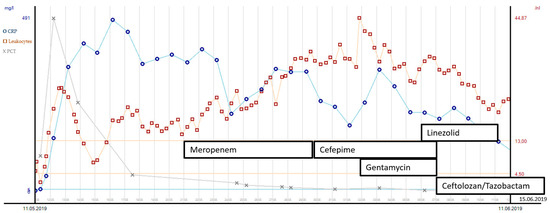 In the following 4 weeks, several re-laparotomies were performed to control the severe abdominal trauma and unclosed traumatic bladder injury. First, microbiology cultures from intra-abdominal swabs revealed broadly susceptible PA strains. Meropenem was administered due to its low sodium content and its probably lesser epileptogenic potential compared to imipenem. After the sixth abdominal procedure (at day 17), PA strains in abdominal swabs revealed multidrug resistance and were susceptible only to cefepime, fluoroquinolones and colistin. Therefore, cefepime was administered in combination with gentamicin for 7 days. Liver function was not compromised due to liver laceration. Another incision and stitching of the bladder were performed on day 21, after which XDR-PA strains were cultured in fresh abdominal swabs. These strains presented with resistance to cefepime and fluoroquinolones, so a new fifth-generation cephalosporin in combination with an old beta-lactamase inhibitor ceftolozane/tazobactam (C/T) was applied for a total of 10 days, since the minimal inhibitory concentration (MIC) for C/T was 1 µg/mL. The microorganisms found and the antibiotic susceptibility testing results are displayed in Table 1. See Figure 2 for the leucocyte count, procalcitonin (PCT) and c-reactive protein (CRP) course with corresponding antibiotic treatment over the first 30 days of the patient’s ICU stay. The patient’s kidney function showed an initial peak on day 2 after ICU admission with acute kidney insufficiency (creatinine values of 1.67 mg/dL, clearance 45 mL/min CKD-EPI) due to severe crush syndrome. The creatinine values normalized soon thereafter with normal values (clearance > 60 mL/min/1.73 m2) throughout the ICU stay. Due to severe craniocerebral injury and cerebral infarction, long-term dependency from mechanical ventilation was expected. This led to surgical tracheostomy on day 10 after ICU admission. During the weaning process, there was one setback with ventilator-associated pneumonia due to Serratia marcescens (see Table 1 for the susceptibility results). After the antibiotic treatment course with cefepime, pneumonia resumed, and weaning could be proceeded. Three weeks after tracheostomy, the patient could be successfully weaned from the ventilator.
