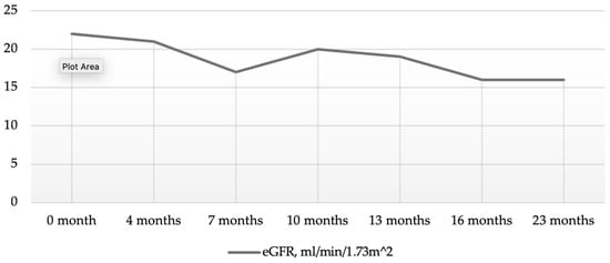 To investigate a possible genetic mutation in this patient, a genetic analysis for hereditary kidney diseases was conducted. Informed consent for genetic analyses was obtained. A pathogenic mutation p.[(Leu129*)] (c.386T>A) in exon 6 of the CLCN5 gene was identified by gene panel testing for renal diseases using a next-generation sequencing, which corresponds to a diagnosis of Dent disease. Genomic DNA was extracted from the peripheral blood of the patient. A close follow up, along with angiotensin-converting enzyme (ACE) inhibitors and rosuvastatin, has been continued to date. The patient’s kidney function continued to worsen (Figure 3), and therefore a peritoneal dialysis catheter was implanted. He was included on the waiting list for renal transplantation and renal replacement therapy has not yet been started.