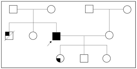 Family tree of the patient. Note: Arrow denotes the patient with Dent disease. Square represents male member, and circle represents female member. The quarter-filled square represents the patient’s brother with renal hypoplasia, whereas the quarter-filled circle represents the patient’s daughter with nephrocalcinosis.