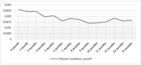 Course of renal function after transferring to a tertiary care nephrologist. Note: Kidney function was evaluated as 1/creatinine level (grey line). The 0 month marker represents the beginning of regular visits to a tertiary care nephrologist in May 2021 (SCr—386 μmol/L). The patient is under the supervision of a tertiary care nephrologist until present. The figure shows data on kidney function for 15 months (until August 2022) (SCr—602 μmol/L).