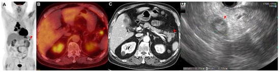 Patient 1: a 71-year-old man diagnosed with non-small-cell lung cancer (NSCLC) with a solitary metastasis in the tail of the pancreas. (A–C) Positron emission tomography/computed tomography (PET/CT) showed a solitary metastatic lesion (red arrowhead) in the tail of the pancreas. (D) EUS-FNA was performed at the metastatic lesion (red arrowhead) in the pancreas.