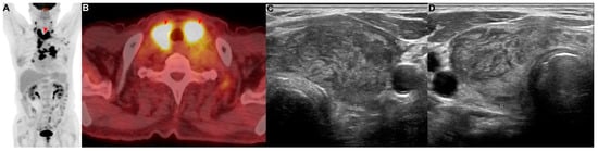 A 77-year-old man with a medical history of diabetes mellitus was referred for an abnormal chest radiograph, which was taken at a public health clinic. He had a history of 57 pack years of smoking. He stated that he did not take any medications or have any illnesses, including cardiovascular, allergic, rheumatic, or respiratory conditions. A contrast-enhanced CT scan of the chest showed a lung mass invading a lobar bronchus of the left upper lobe. A bronchoscopic biopsy was performed and squamous cell carcinoma was diagnosed. If there was no metastasis, the tumor was considered stage IIIC as T4N3. There was no suspicious finding of distant metastasis except for a hypermetabolic lesion (SUVmax = 13.42) of the bilateral lobes of the thyroid gland in PET/CT (Figure 2A,B). FNA and cytology were performed on the lesion of the left thyroid gland (Figure 2C,D), and metastasis of squamous cell carcinoma was confirmed (Figure A1B). This patient was treated with six courses of platinum-based chemotherapy (gemcitabine and cisplatin) for stage IV squamous cell carcinoma.