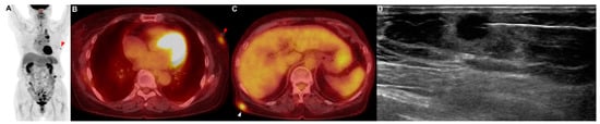 A 79-year-old woman who had never smoked presented with 2 weeks of hoarseness and a history of hypertension and diabetes mellitus. She stated that she had no other illnesses, including cardiovascular, allergic, rheumatic or respiratory conditions. A contrast-enhanced CT scan of her chest showed that a lung mass originating in the left upper lobe had invaded the mediastinum. No endobronchial tumor was observed on the bronchoscopy, and a narrowing of the apicoposterior segmental bronchus of the left upper lobe was observed. Adenocarcinoma was confirmed by brushing cytology of the apicoposterior segmental bronchus of the left upper lobe. If there was no metastasis, the tumor was considered stage IIIB as T4N2. On the PET/CT scan, hypermetabolic lesions were observed in the subcutaneous layer of the middle part of the right back (SUVmax = 4.64) and in the left breast (SUVmax = 3.52) (Figure 3A–C). A core-needle biopsy was performed on the lesion in the left breast (Figure 3D), and the pathological examination reported metastasis of lung adenocarcinoma (TTF-1: positive; GATA-3: negative) (Figure A1C,D). In addition, an excision biopsy was performed on the lesion of the right back, and the pathological examination showed metastasis of the lung adenocarcinoma (TTF-1: positive; ALK: negative; GATA-3: negative; CDX-2: negative) (Figure A1E,F). Additionally, EGFR 19 deletion mutation was detected in this metastatic tissue using an EGFR PCR test. Therefore, this patient was treated with an EGFR tyrosine kinase inhibitor for EGFR-mutated-stage-IV adenocarcinoma.