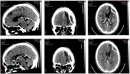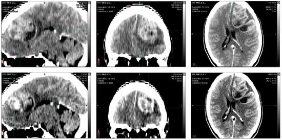In August 2016, in the emergency department, a 36-year-old woman, after 15 days of headache and unresponsiveness to non-steroidal anti-inflammatory drugs (NSAID), underwent a computed tomography scan (CT scan). The CT scan of the brain, performed with contrast medium, showed, in the left fronto-parietal area, two voluminous formations and inhomogeneous contiguous focalities of 52 × 41 mm and 40 × 20 mm, respectively, characterized by irregular peripheral impregnation and contextual necrotic–colliquative areas, with surrounding perilesional digitiform hypodensity, compression of the lateral ventricle, and contralateral shift of the midline structures (1 cm) (Figure 1).
