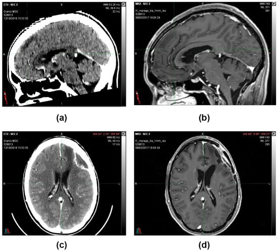 Figure 3. (a,c) 12 October 2016, CT scan image with contrast medium. Posterior to the surgical cavity, an approximately 2 cm hyperdense solid nodule is present (b) 9 February 2017, MRI T1 sequence with contrast medium. After the first cycle of O2O3 therapy, the 2 cm residual tumor mass that was present 3 months before was no longer visible (d) 9 February 2017, MRI image sequence in Fluid-attenuated inversion recovery (FLAIR).