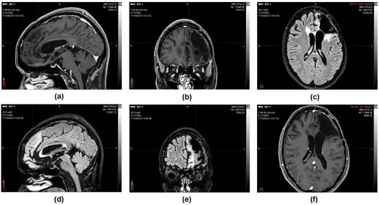 Figure 4. 11 October 2022, instrumental examination, stable negative picture. (a,b,f) MRI images, T1 sequence with contrast medium. (ce) MRI images, sequence in FLAIR. The morphological picture remained stationary—the T2 hyperintensity surrounding the known left frontal malacic cavity extended to the knee and right root of the corpus callosum and in the left semioval center and was without mass effect and not modified in the contrastographic phases. Non-focality of new onset at the remaining levels. In the spongiosa of the left frontal bone in the median region and on the profile of the operculum, there are two areas of altered signal with contrastographic impregnation, both of which are stationary. The median structures are on an axis. The ventricular cavities and subarachnoid spaces are overlapping in size and morphology.