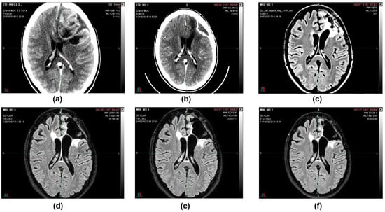 Figure 5. (a) 21 August 2016, CT image with contrast medium before surgery. (b) 12 October 2016, CT image with contrast medium after partial removal of left frontal multicentric neoplasm. (c) 9 February 2017, MRI image, T1 sequence with contrast medium after the first cycle of oxygen-ozone therapy. (d) 12 July 2021, MRI image sequence in FLAIR. (e) 24 February 2022, MRI image sequence in FLAIR. (f) 11 October 2022, MRI image sequence in FLAIR. Following a total of 5 years after the partial resection surgery, the morphological picture remained stable, and the patient was considered cured.