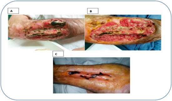 Patient’s admission conditions and management. (A) Skin lesion was very severe at admission, with consistent tissue damage and bone exposure. (B) Lesion cleansed. (C) Wound after treatment with platelet rich plasma + platelet poor plasma.
