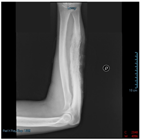 History revealed the use of recreational drugs without viral infections (e.g., HIV, HBV, HCV) or systemic diseases. The patient referred that he refused the plastic surgery for tissue reconstruction and, during the home stay, he used acetaminophen and NSAIDs (ketoprofen, ketorolac, ibuprofen) for pain management without clinical improvement. At the exploration, the patient experienced severe pain (visual analogue scale, VAS 10) with poor sensation. The skin of the forearm was red with signs and symptoms of infection (fever 38.2 °C); the bone, tendons, and muscle were exposed. Interphalangeal joint flexion and extension of the last three fingers was not possible. Blood pressure was 120/78 mmHg, heart rate was 85 beats/min, and oxygen pressure saturation at room temperature was 99%. Plain radiographs excluded the presence of bone fracture but revealed a severe soft tissue edema (Figure 2).