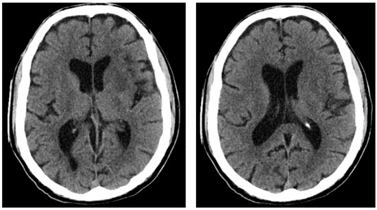 Computerized axial tomography of the patient. Asymmetric ventricular system in the supratentorial area, predominantly on the right and on the midline. General volume increase in the subarachnoid spaces at the top and base. Subtle hypo-density of the left insulo-frontal cortico-subcortical region, partially extending to the corresponding nuclear-capsular region, as if from a recent ischemic lesion.