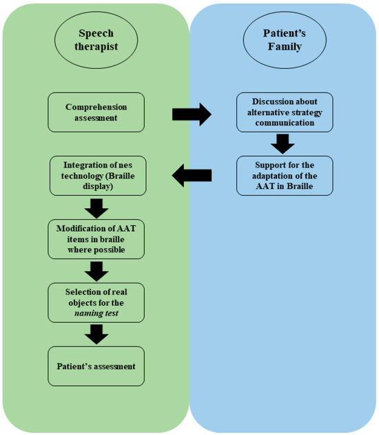 Scheme of the adaptation process of the AAT test to blind patients. After the first approach to the patients, the speech therapist interacted with the patient’s family to study his communication modality and define the strategy for a possible correct approach to the assessment and AAT administration. The patient’s family collaborated with the speech therapist to translate part of the AAT test regarding written language in Braille. For the naming test, we studied which natural object to use for the item regarding the denomination of the objects. After defining the modification to the patient’s AAT test, the test was administered for the patient’s assessment.