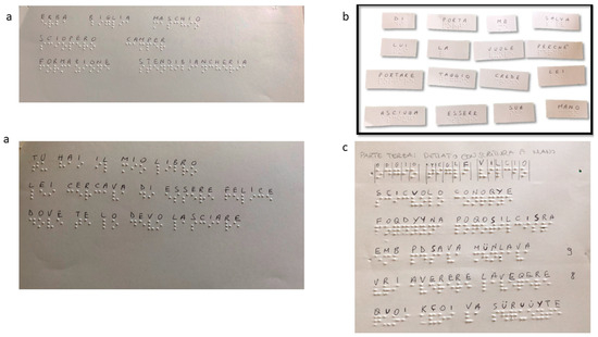Example of adaptation of AAT. (a,b) Reading and Composition—the family’s patient provided the words and phrases in AAT in Braille, allowing for the administration of part of the written language items. (c) Dictation—The patient used the Braille display tool to write in Braille.