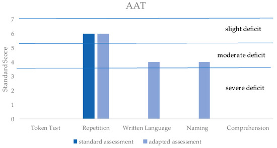 Based on the patient’s score in the different AAT items, the standard score defines the severity level of the deficit for each item (i.e., 1–3: severe deficit; 4–5: moderate deficit; 6–7: slight deficit; 8–10: no deficit). In dark blue is the score that the standard AAT administration would have obtained without the adaptation of AAT; in light blue is the score obtained with the AAT-adapted administration. It is important to note that no adaptation was possible for the token test and comprehension, while the naming item was partially adapted.