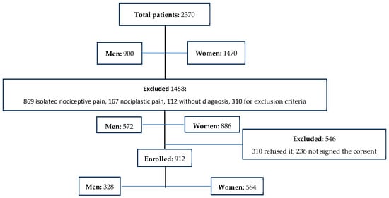 During the study, we analyzed 2370 patients (men: 900, age 59.7 ± 11.6; women 1470, mean age 60.3 ± 11.9). After the evaluation of inclusion and exclusion criteria evaluation, 912 patients (38.5%, mean age 61.4 ± 13; 328 men and 584 women, mean age 60.6 ± 13.4 and 61.8 ± 12.9) with neuropathic pain were enrolled (Figure 1) (Table 1).