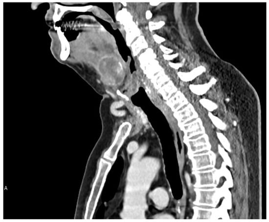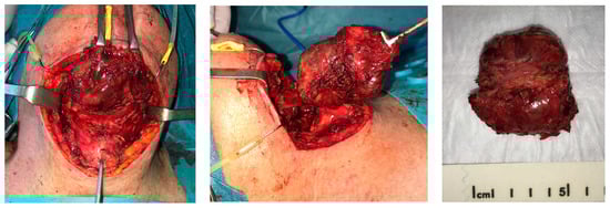 After pathological diagnosis, mass excision surgery was performed under general anesthesia, according to the multidisciplinary tumor board recommendation. Informed consent was obtained from the patient. Surgery consisted of the hyoid resection of the tumor enlarged to suprahyoid and subhyoid muscles. Afterward, a tracheotomy and installation of the Portex-type tracheal cannula were performed, and a nasal feeding tube was inserted (Figure 5).