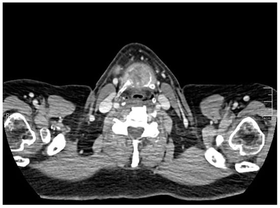 CT demonstrated massive osteolysis and cortical destruction with the enlargement of the body of the hyoid bone. The osteolytic mass of the hyoid bone showed a slight soft tissue extension toward the pre-epiglottic region. An evident extension towards pre-hyoid muscles was also noted. The lumen of the airways was not affected, and no pathological changes were evident in the surrounding structures of the neck (Figure 1, Figure 2 and Figure 3).