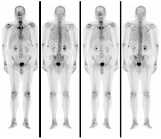 During the postoperative period, the patient received chemotherapy treatment. In that period, he also had a bone scintigraphy and an 18-F-FDG PET/CT. (Figure 7).