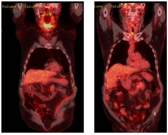 A not painful tumefaction of the middle anterior neck region is common in clinics and, above all, in children or young adults. It usually is a benign mass of hyoid bone that originates from the thyroglossal duct, and it can still be found in adults with atypical symptoms [], lymphadenopathy by other causes such as acute infection, chronic inflammatory conditions or a benign lesion like a lipoma. Other causes of both cervical lymphadenopathy and dysphagia, like lymphoma, high esophageal cancer or other head and neck cancers, can be considered in the differential diagnosis. In the literature, there are a few cases of hyoid bone metastasis from distal malignant tumors, such as breast cancer, renal cell carcinoma, lung adenocarcinoma, melanoma and hepatocellular carcinoma [,,,,]. Lung adenocarcinoma is more prone to vascular invasion and distant metastasis than squamous carcinoma []. Lung adenocarcinoma can also metastasize to the hyoid through the circulatory system, in particular, through the branch of the superior laryngeal artery. Any patient with a hyoid tumor and a previous history of melanoma should be considered in the differential diagnosis for metastatic melanoma []. Melanoma frequently metastasizes to cervical lymph nodes in the head and neck; bone metastases are observed in 11–17% of patients and usually occur in the axial skeleton []. The hyoid bone is also reported as a rare site of metastases in patients with renal cell carcinoma (RCC) [] and in patients with rare lymphoproliferative disorders like solitary plasmacytoma (SP) and unicentric Castleman disease (UCD), characterized by a single set of locally enlarged lymph nodes []. A rare site of hyoid bone metastases in a patient with RCC is described and documented by 18F-fludeoxyglucose (FDG)-positron emission tomography/a computed tomography (PET/CT) scan with metastases to bilateral lungs and multiple skeletal sites []. The osteolytic mass in hyoid bone suggestive of hyoid bone metastasis was confirmed using transaxial PET/CT and CT images with increased tracer uptake []. Zhang et al. described the case report of a man with a neck mass and a progressive foreign body sensation in the throat. The patient was evaluated with 18F-FDG positron emission tomography, which revealed focally increased radioactivity in the hyoid bone, and CT revealed osteolytic lesions [].