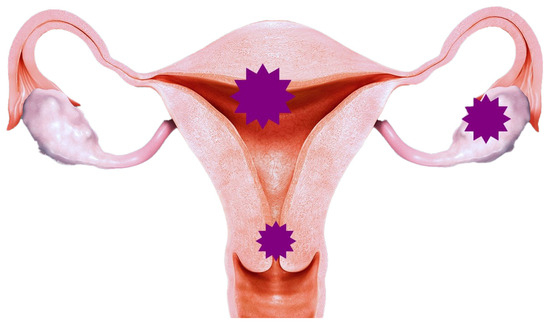 - Shah, M.; Aman, A.; Vaswani, B.; Rajesh, B.J.; Sreekanth, C.N. Triple Synchronous Primary Malignancies of Ovary, Endometrium and Cervix—A Rare Case Report. JMSCR 2018, 06, 16–22. [Google Scholar] [CrossRef]