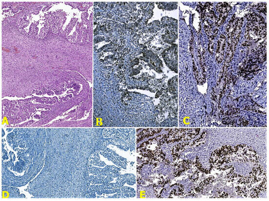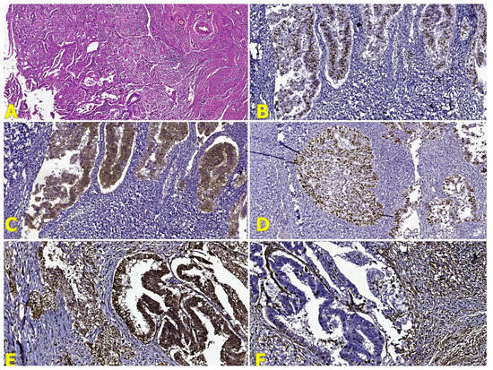 - Stolnicu, S.; Hoang, L.; Hanko-Bauer, O.; Barsan, I.; Terinte, C.; Pesci, A.; Aviel-Ronen, S.; Kiyokawa, T.; Alvarado-Cabrero, I.; Oliva, E.; et al. Cervical adenosquamous carcinoma: Detailed analysis of morphology, immunohistochemical profile, and clinical outcomes in 59 cases. Mod. Pathol. 2019, 32, 269–279. [Google Scholar] [CrossRef]