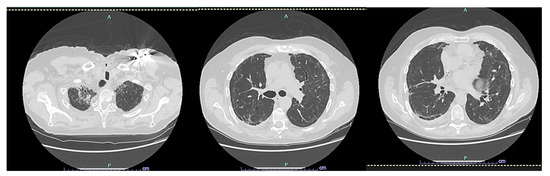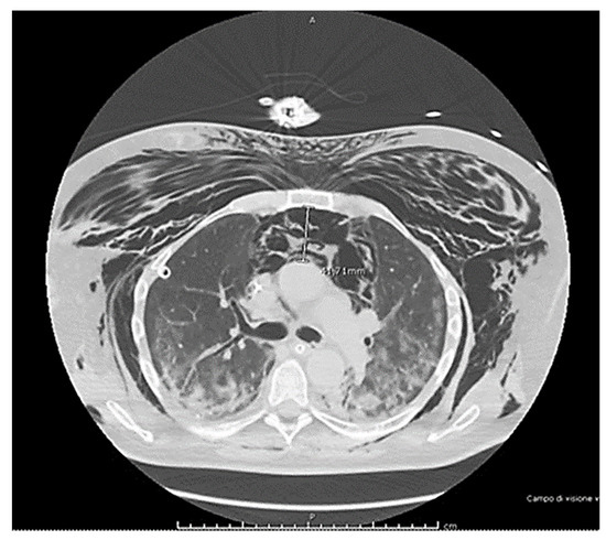 A COVID-19 patient, a 64-year-old man with no pre-existing health conditions, a non-smoker, no emphysema, or any chronic therapy, was admitted to the intensive care unit due to progressive shortness of breath. Initially, the patient responded to non-invasive mechanical ventilation, which helped improve his breathing function, but after six days, his respiratory function deteriorated significantly, requiring invasive ventilation. Suddenly, there was a development of SPM and extensive subcutaneous emphysema, and the next day, a spontaneous pneumothorax occurred, which was successfully drained. After that, it became evident that there was extensive subcutaneous emphysema. The chest CT scan confirmed the presence of spontaneous pneumomediastinum, but it did not affect the patient’s hemodynamics (Figure 1). The physicians performed a bronchoscopy and imaging with a contrast medium, which ruled out any lesions to the trachea or esophagus. No other issues related to the problem were identified during the examination. Unfortunately, microscopic bullae of interstitial emphysema, or micro air leaks, are visible when they are an adequate size on computed tomography [5]. Micro air leaks can be identified through CT scans, and one such effect that can be observed is the Macklin effect. Recent literature and studies not available during the case report demonstrated that if the Macklin effect is detected at the CT scan baseline, it could predict the occurrence of pneumothorax or pneumomediastinum [6,7]. The patient survived after six months of hospitalization and was discharged to a different facility for respiratory rehabilitation to treat long-term COVID-19 complications.