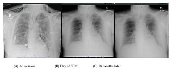 The figure reports a chest radiograph of the patient at admission (A) at the day of the SPM (B) and 18 months later (C).