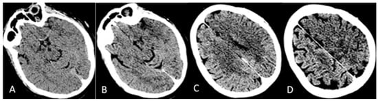 Figure 1. Brain CT on day one. (A) Vessel hyperdensity on the left of thrombotic significance and bifurcation of the siphon, the M1, and the A1–A2 tracts; (BD): Cortico–subcortical temporo-insular and fronto-cingulum-parietal hypodensity. ASPECT score 4.