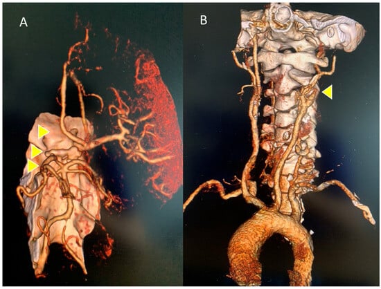 Figure 2. Intracranial and epiaortic angio-CT: (A) left anterior circulation occlusion: intracranial internal carotid, middle cerebral (MCA), anterior cerebral arteries; (B) lack of opacification on the left of the internal carotid artery a few mm from the origin. Thrombotic occlusion areas are indicated by yellow arrows.