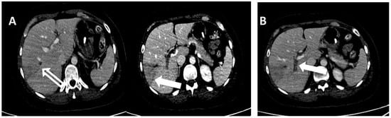 Figure 3. Thrombosis of the right segmental branch of the portal vein is associated with partial thrombosis of the related branch of the ipsilateral hepatic vein (empty arrow) panel (A). An area of parenchymal hypoperfusion involving V and VIII segments is seen (full arrow) panel (B).