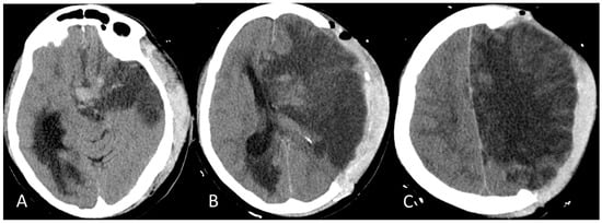 The patient was then admitted to the Neurology Unit. She appeared alert, with severe aphasia and right hemiplegia. She did not show signs of hemorrhagic diathesis, no petechiae, nor bleeding from the sampling sites. Therapy with 40 mg intra-venous (i.v.) dexamethasone; i.v. High Dose IgG (IgG-HD) 1 g/Kg once daily for two days; and subcutaneous (s.c.) fondaparinux 2.5 mg once daily was started. The patient’s clinical condition deteriorated rapidly. She went into a GCS 5 coma on the second day, with pupillary anisocoria from left > right, right hemiplegia, tachypnea, and severe respiratory failure (at EGA: pO2 64; pCO2 19; pH 7.5). A brain CT scan was then performed revealing a more significant enlargement of the ischemic cerebral lesion in the left hemisphere with transtentorial uncal herniation to the right of the third ventricle and the left lateral ventricle, obliteration of the suprachiasmatic cistern, and enlargement of the right temporal horn, as from incipient hydrocephalus, as is shown in Figure 4A–C.