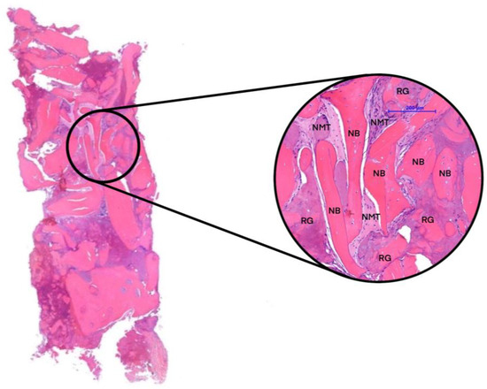 Histological section. Newly formed bone (NFB), residual graft particles (RGs), and non-mineralized tissue (NMT).