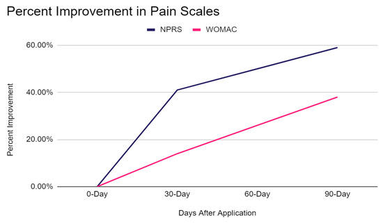Figure 2 compares the percent improvement in the NPRS and WOMAC scales. The figure illustrates a steep improvement in NPRS from initial application to 30 days after application and a gradual improvement from 30 to 90 days. In comparison, the WOMAC experienced a steady, gradual improvement from application to 90-day follow-up.